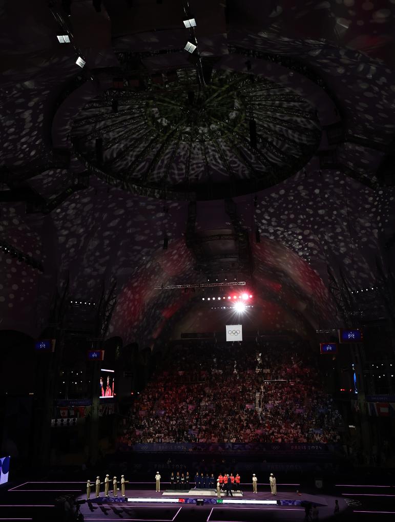 8月1日,冠军美国队(中)、亚军意大利队(左)、季军日本队在颁奖仪式上。