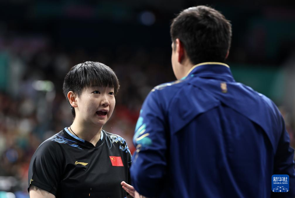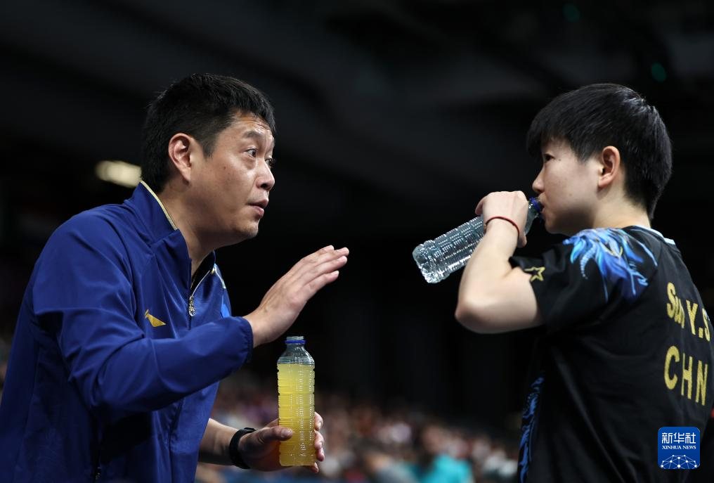 8月2日,孙颖莎(左)在比赛中接受教练邱贻可的指导。新华社记者 王东震 摄