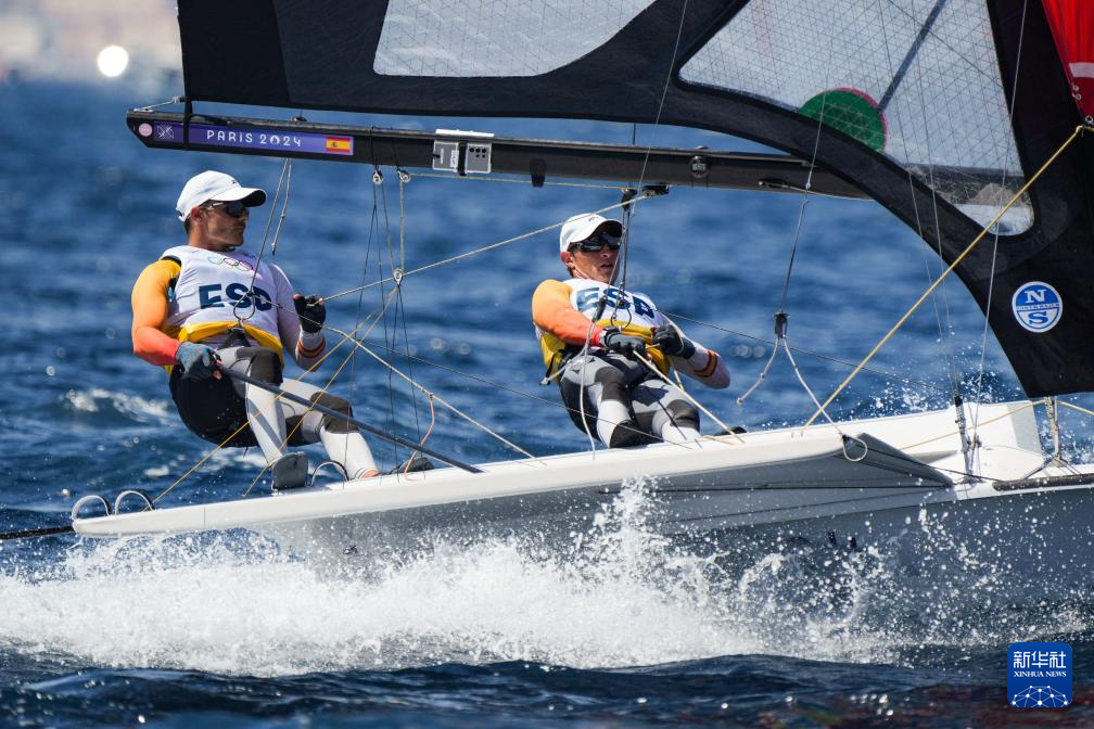 8月1日,西班牙选手迭戈/弗洛里安在男子49人级奖牌轮中,但随后该比赛因风力不足而被取消。新华社记者 郑焕松 摄