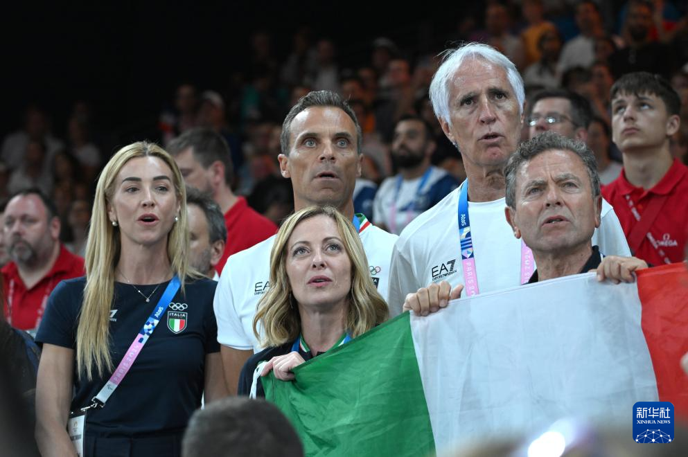 8月1日,这是意大利总理梅洛尼(前排中)在颁奖仪式上唱国歌庆祝。新华社记者 武巍 摄