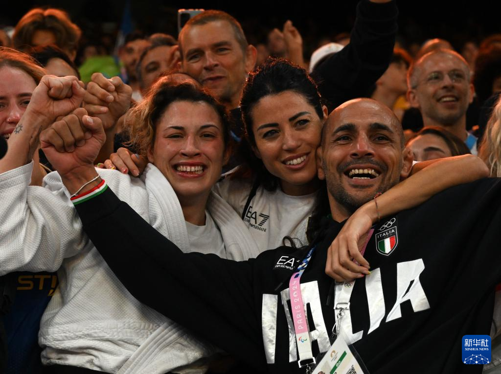 8月1日,意大利选手阿莉切·贝兰迪的教练在庆祝比赛胜利。新华社记者 李安 摄