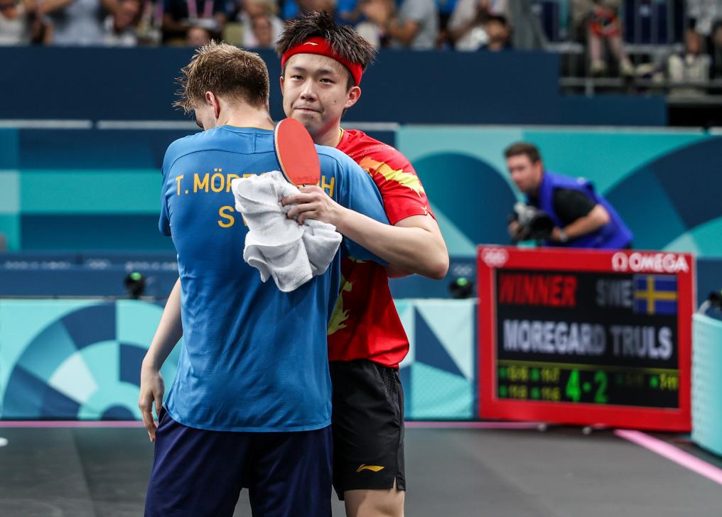 7月31日,王楚钦(右)在赛后向对手致意。新华社记者 朱峥 摄