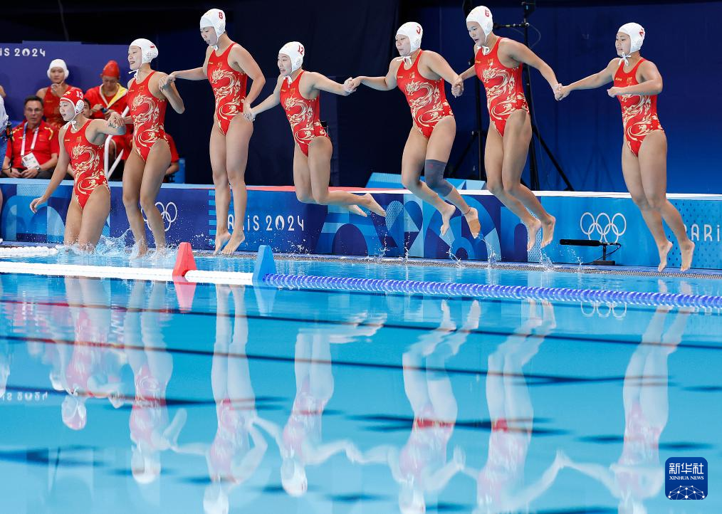 8月2日,中国队球员在比赛前一起跃入水中。