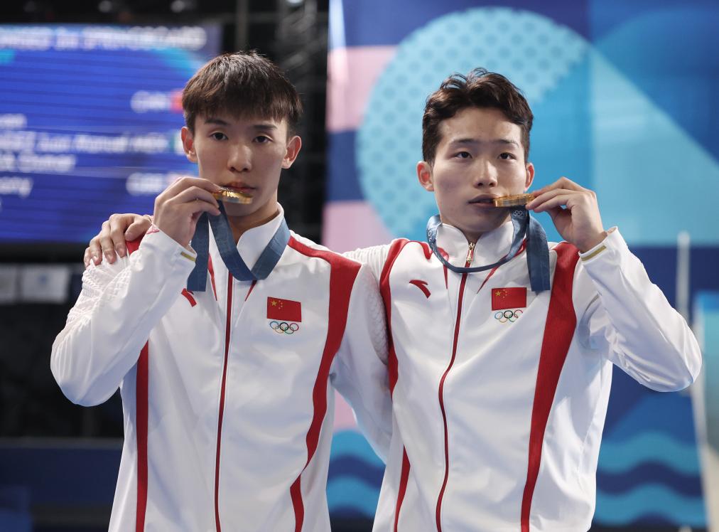 8月2日,冠军中国选手龙道一(左)/王宗源合影。新华社记者 张玉薇 摄