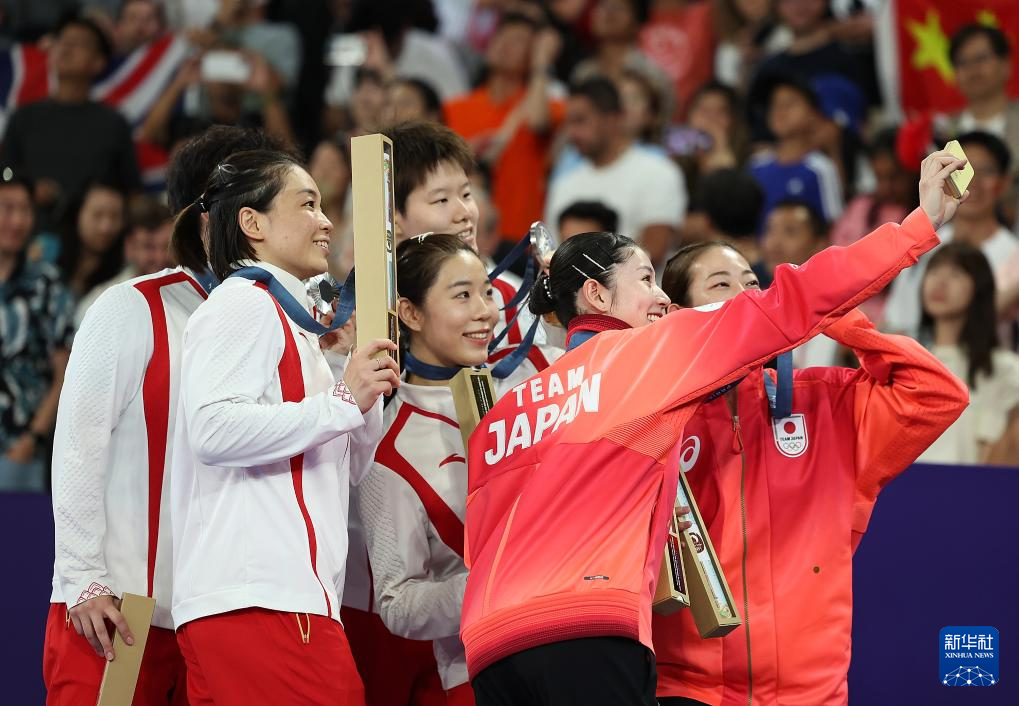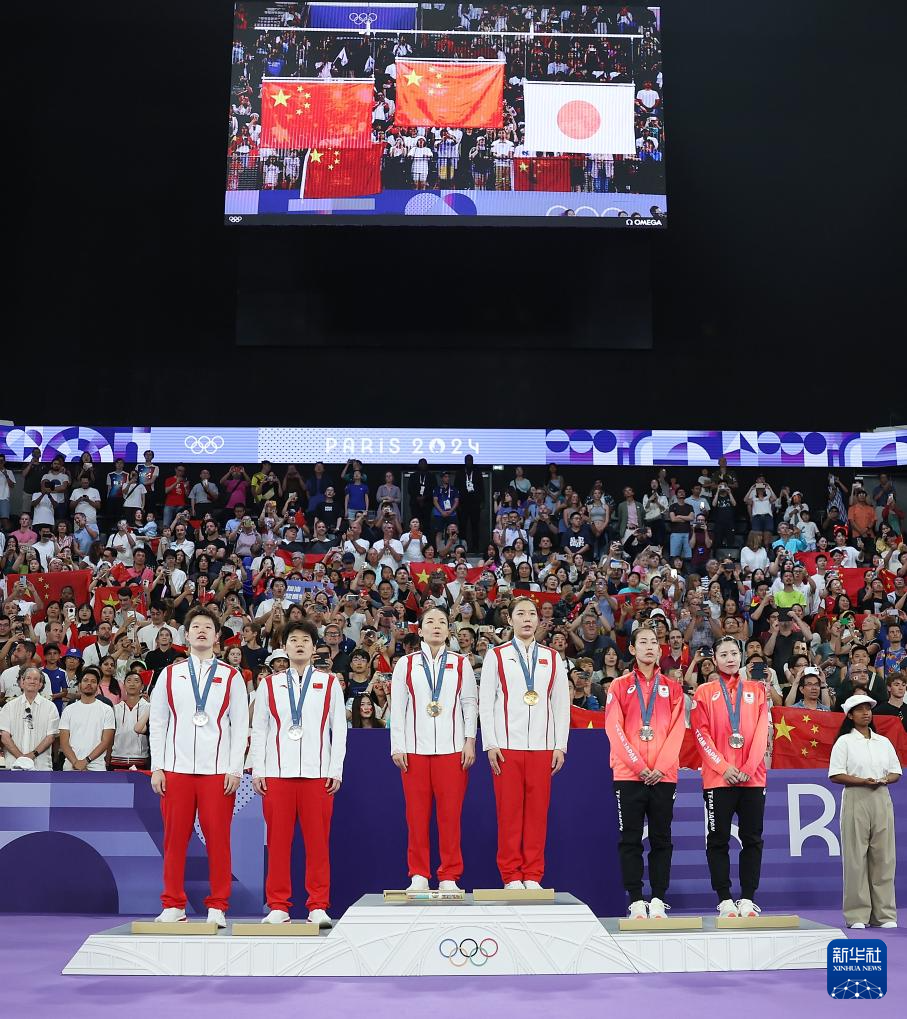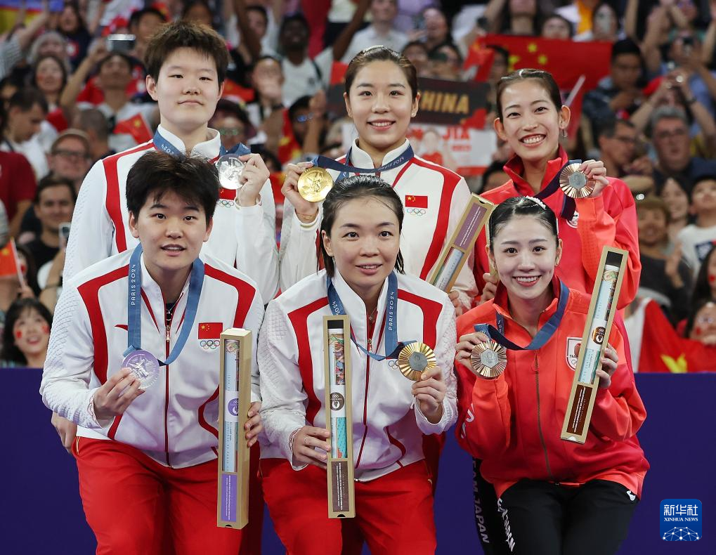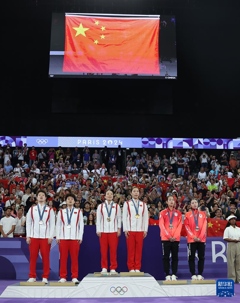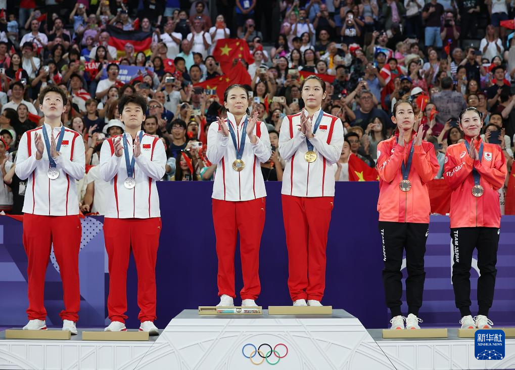 8月3日,冠军中国组合陈清晨(左三)/贾一凡(右三)、亚军中国组合刘圣书(左一)/谭宁(左二)、季军日本组合松山奈未(右二)/志田千阳在颁奖仪式上。