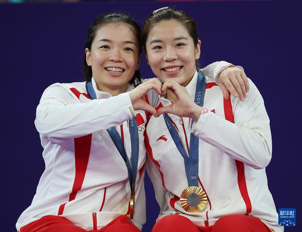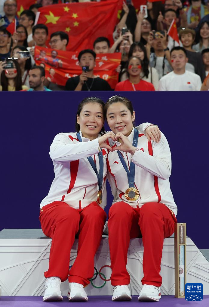 8月3日,冠军中国组合陈清晨(左)/贾一凡在颁奖仪式上合影。
