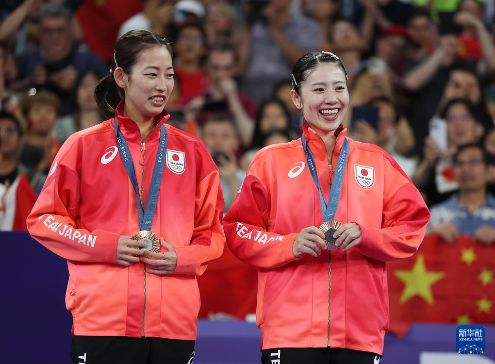 8月3日,季军日本组合松山奈未(左)/志田千阳在颁奖仪式上。