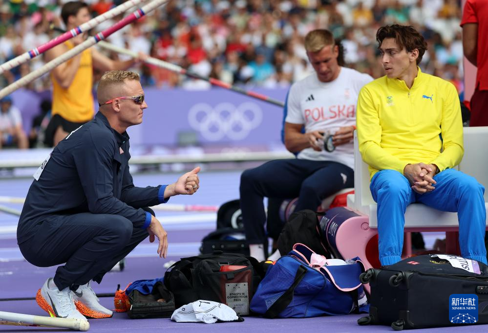 8月3日,瑞典选手杜普兰蒂斯(右)和美国选手肯德里克斯在比赛前交流。