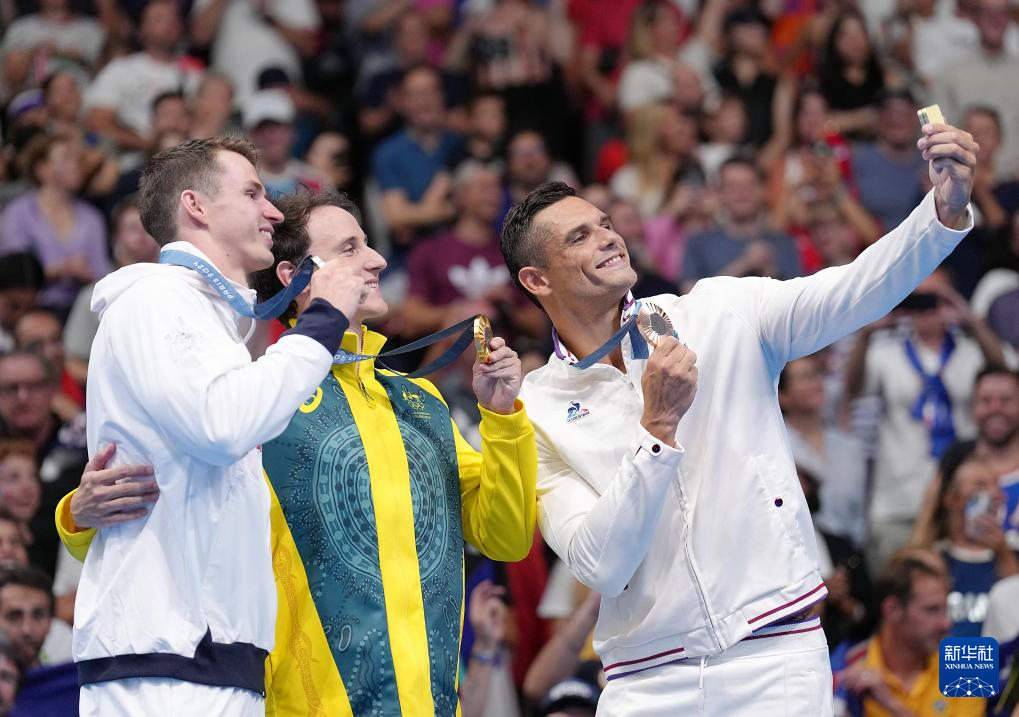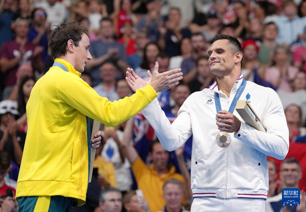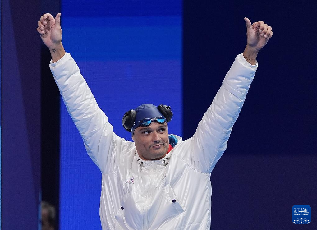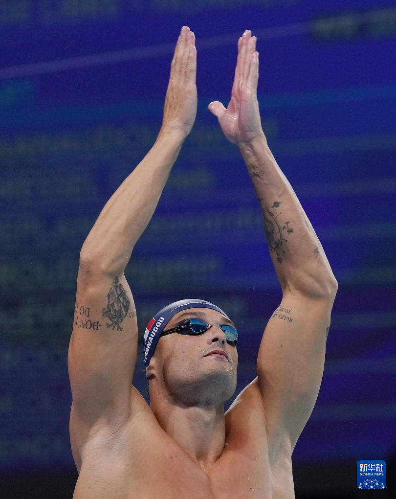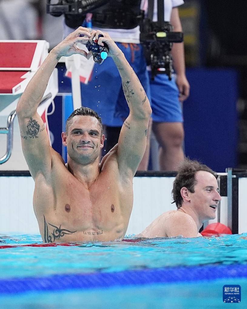 当日,巴黎奥运会游泳项目男子50米仰泳自由泳决赛在拉德芳斯体育馆举行。