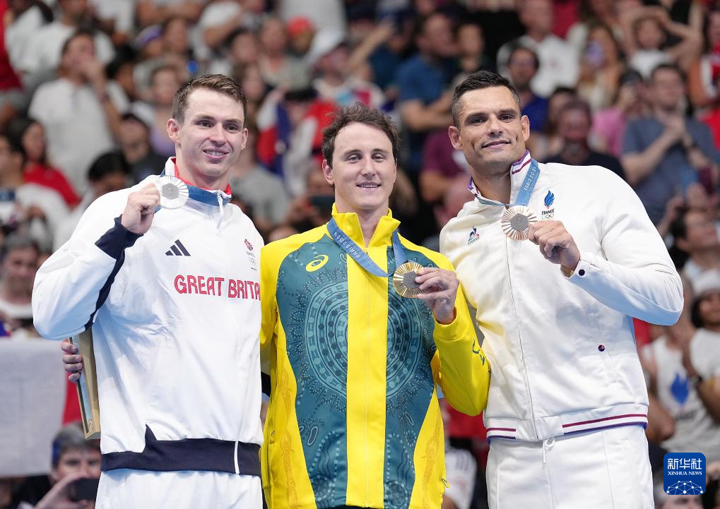 8月2日,冠军澳大利亚选手麦克沃伊(中)、亚军英国选手普劳德(左)和季军法国选手马诺杜在颁奖仪式上合影。