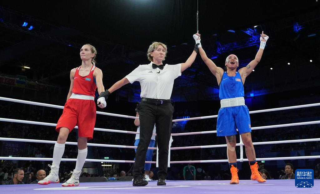 8月2日,裁判宣布波多黎各选手洛萨达·莫塔(右)战胜哈萨克斯坦选手易卜拉欣莫娃。