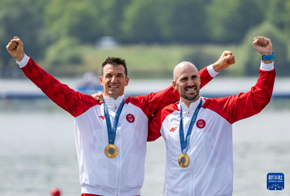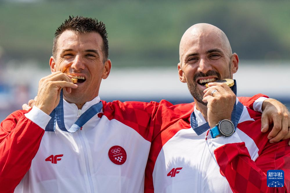 8月2日,获得冠军的克罗地亚组合马丁·辛科维奇(右二)和瓦伦特·辛科维奇(右一)在比赛中。新华社记者 孙非 摄