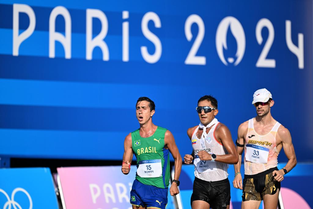 8月1日,巴西选手邦菲(左)在巴黎奥运会男子20公里竞走比赛中。新华社记者 宋彦桦 摄