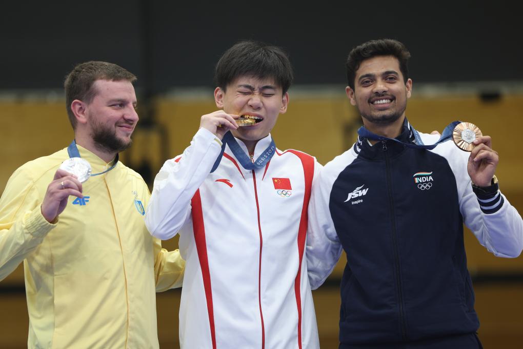 8月1日,巴黎奥运会男子50米步枪三姿冠军中国选手刘宇坤(中)、亚军乌克兰选手库利什(左)和季军印度选手库萨莱在颁奖仪式上。新华社记者 赵丁喆 摄