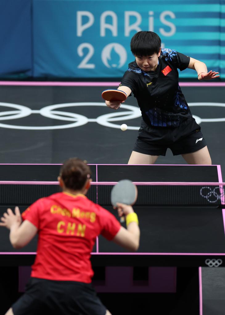 8月3日,孙颖莎(上)、陈梦在比赛中。新华社记者 刘续 摄