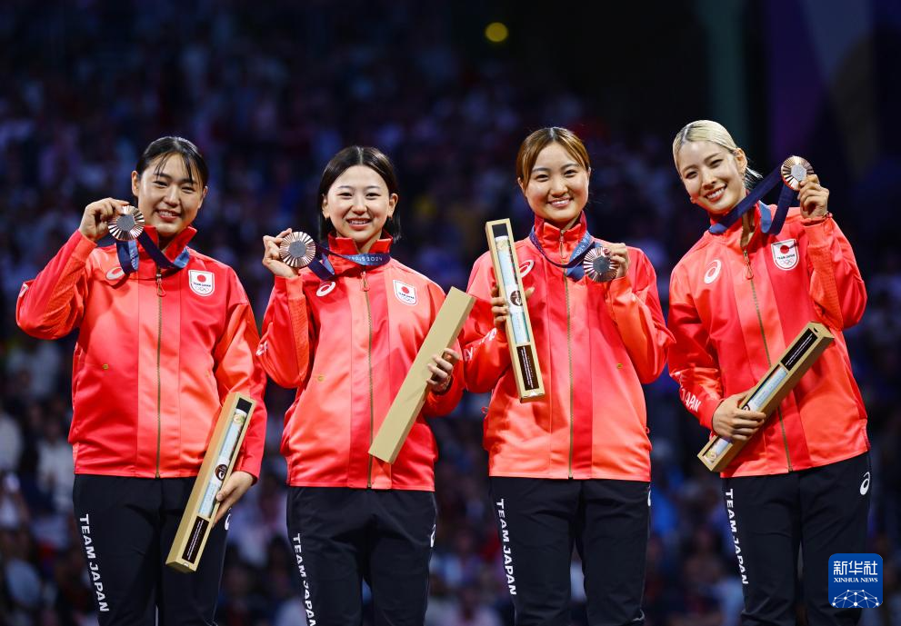 8月3日,季军日本队在颁奖仪式上合影。