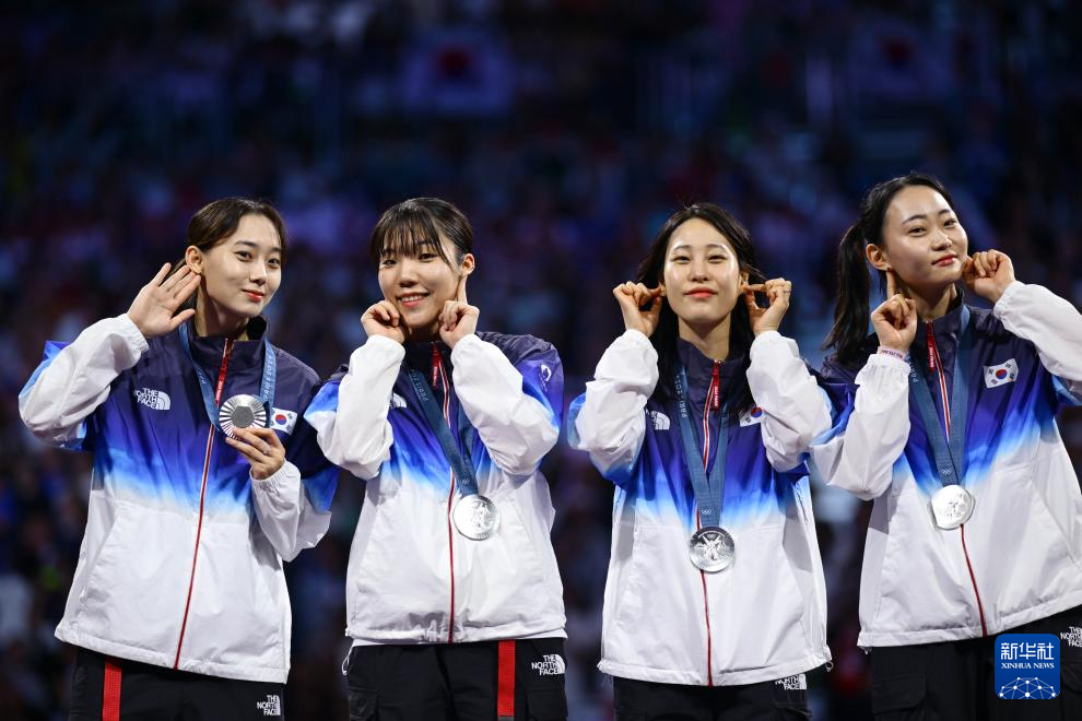 8月3日,亚军韩国队在颁奖仪式上合影。