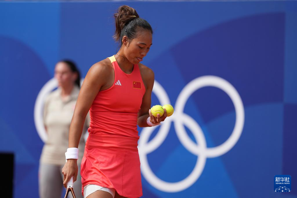 8月3日,郑钦文在比赛后身披国旗庆祝夺冠。