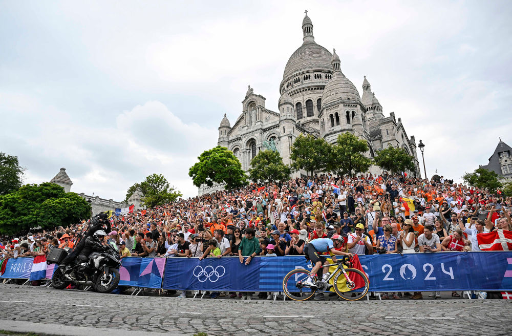 ↑8月3日,比利时选手埃费内普尔在自行车男子公路赛中骑行经过圣心大教堂。