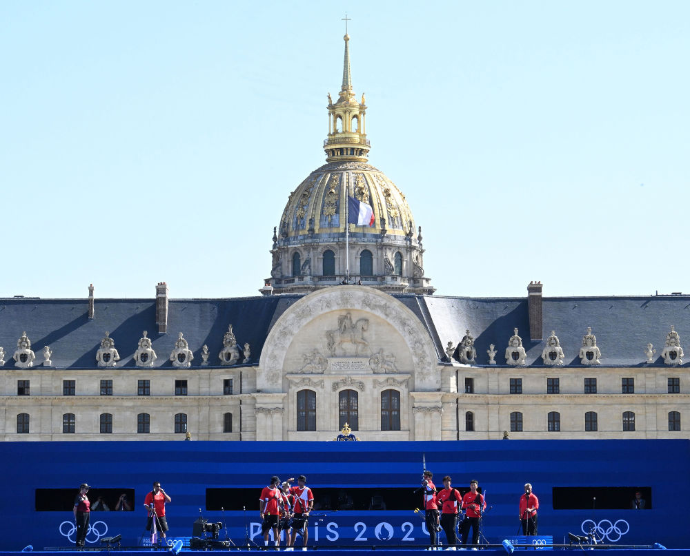 ↑7月29日,射箭男子团体铜牌争夺战在巴黎荣军院举行。