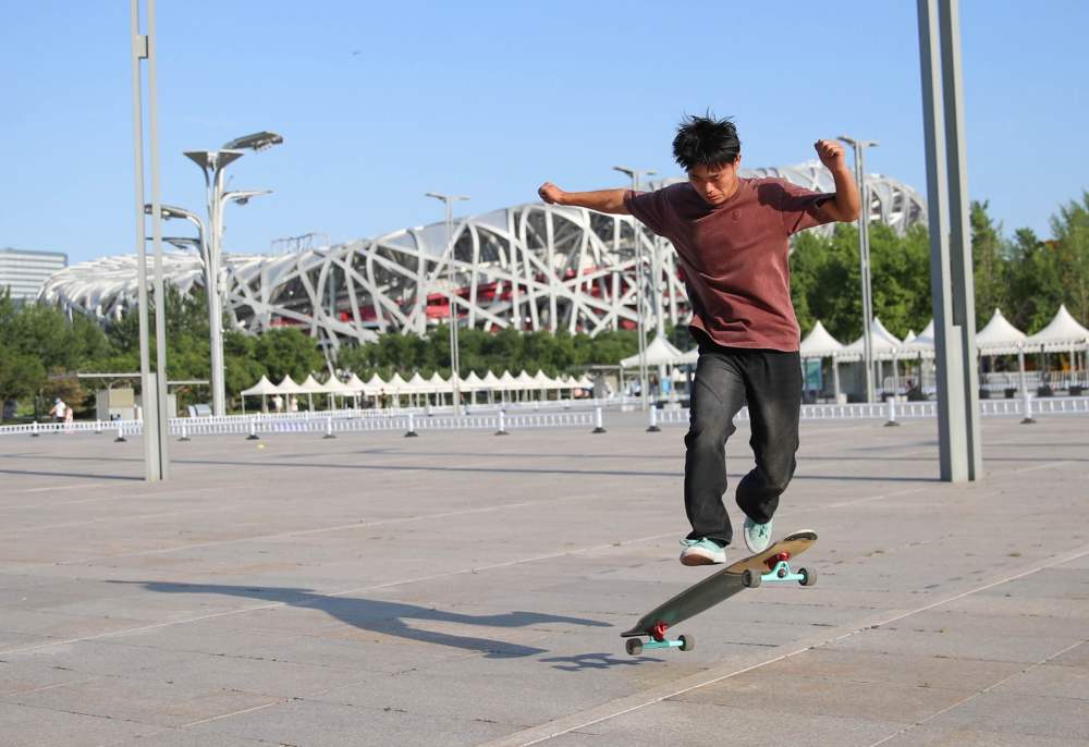 ↑2024年6月29日,一位滑板爱好者滑板公园练习动作。他的身后是国家体育场“鸟巢”。