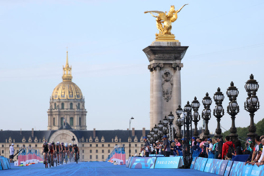 ↑7月31日,女子铁人三项参赛选手骑行通过亚历山大三世桥,她们的身后是巴黎荣军院。