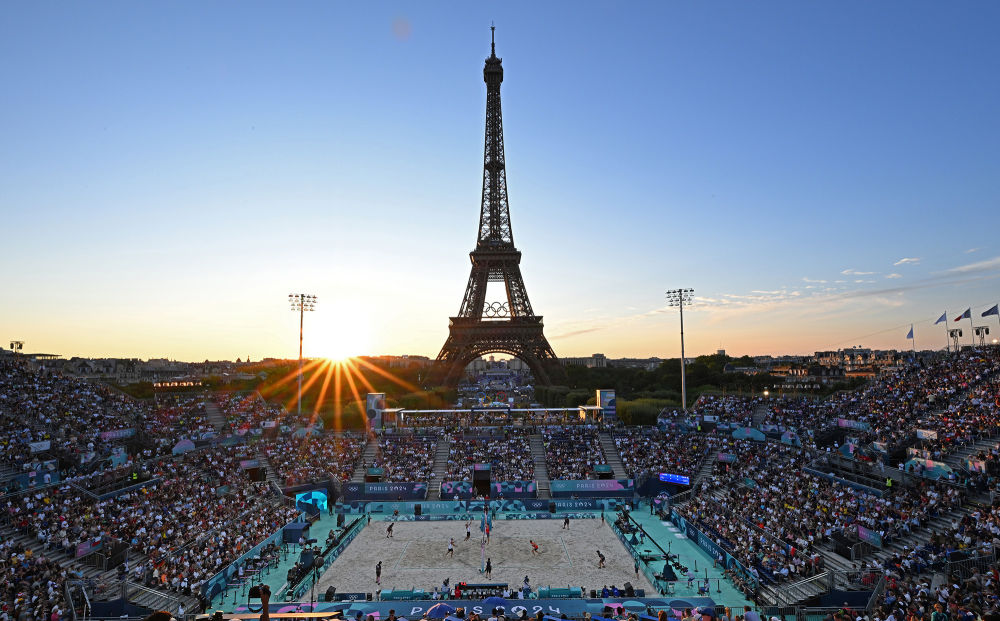 ↑7月28日,在埃菲尔铁塔体育场举行的沙滩排球男子小组赛中,挪威组合莫尔/瑟吕姆与智利组合马尔科·格里马尔特/埃斯特万·格里马尔特在比赛中。