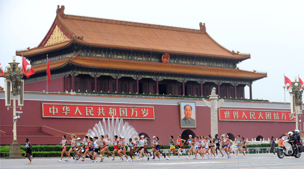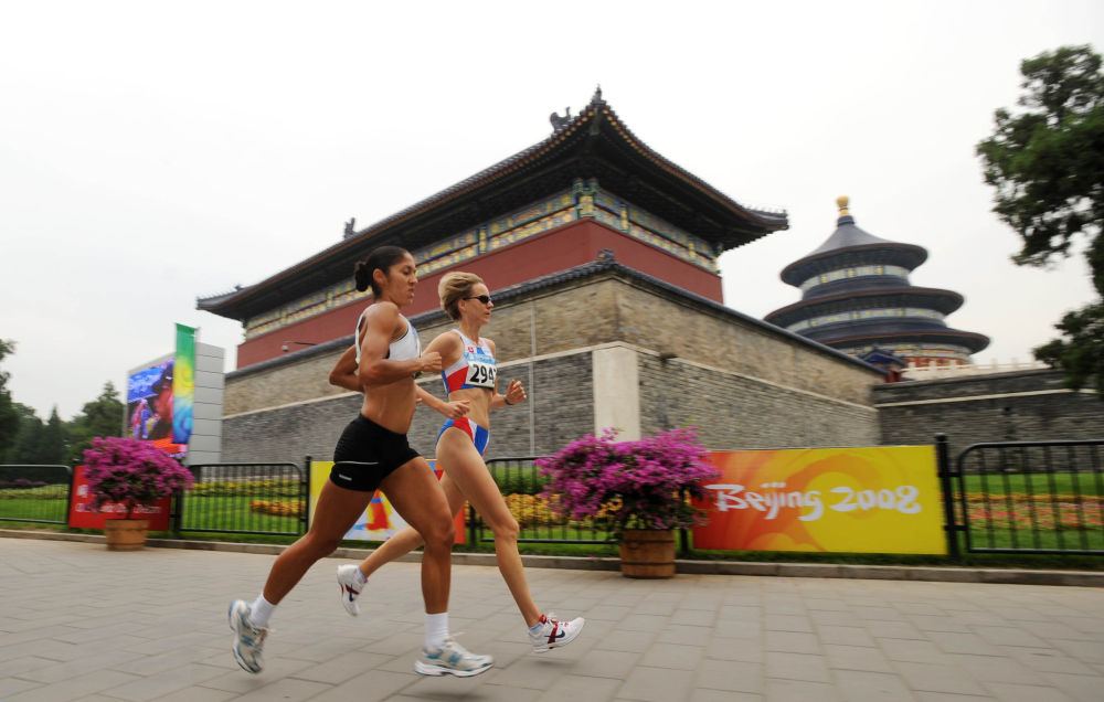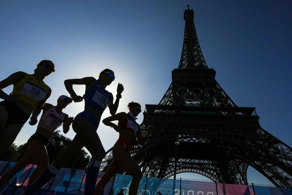 ↑8月1日,女子20公里竞走参赛选手从埃菲尔铁塔下经过。
