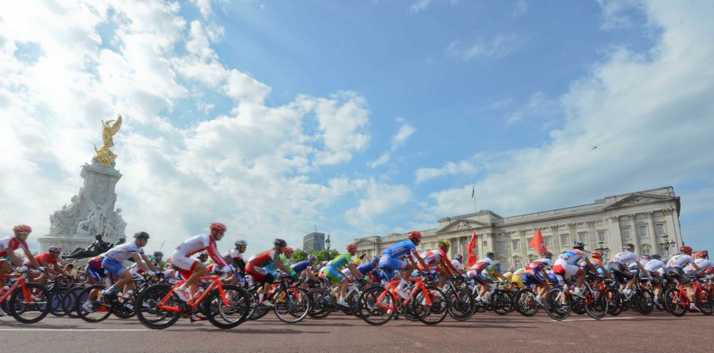 ↑2012年7月28日,在伦敦奥运会男子公路自行车赛中,运动员骑行经过白金汉宫。