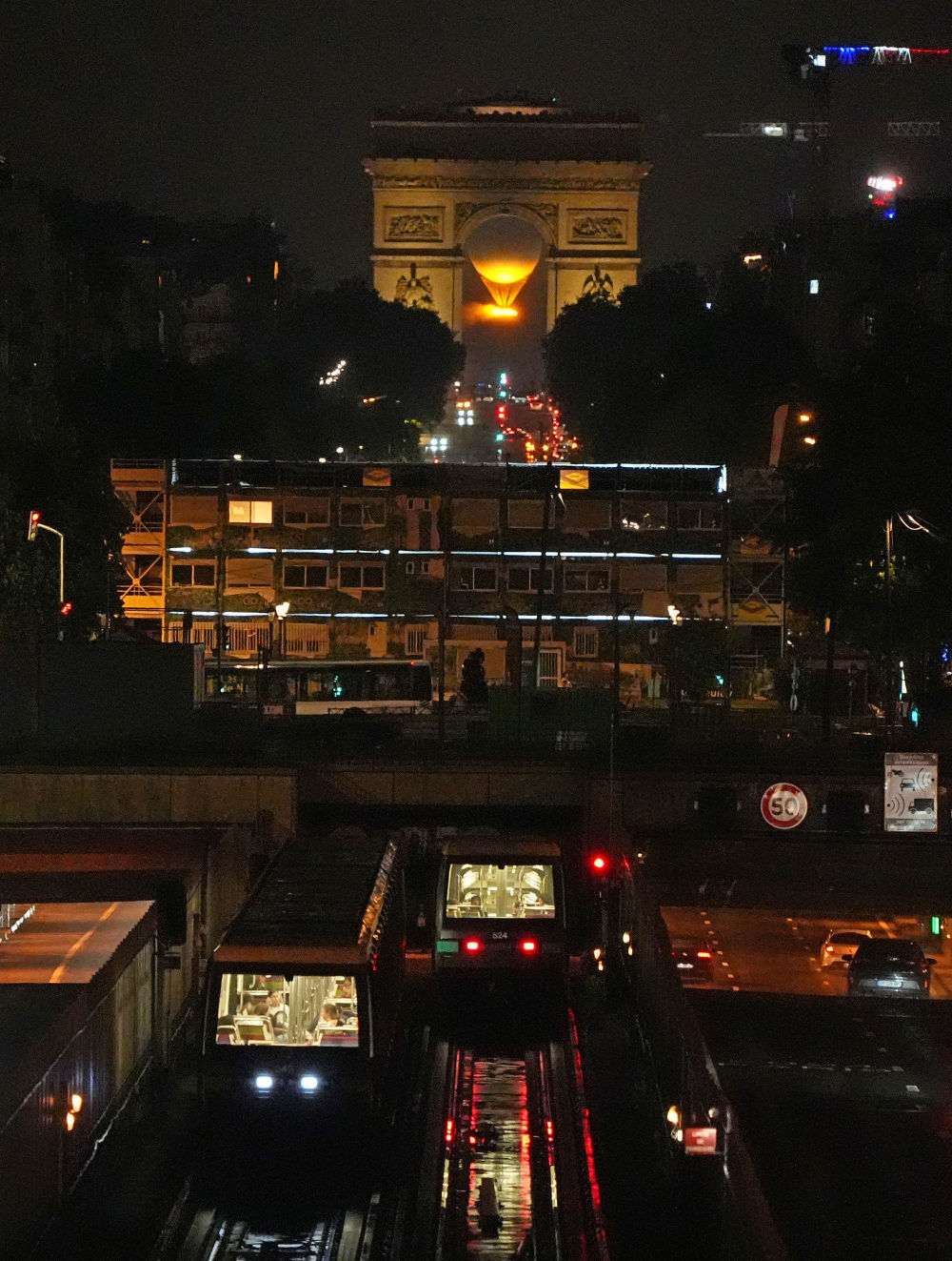 ↑2024年7月26日,当热气球形状的奥运火炬升空,地铁载着市民通勤于巴黎城市之中。