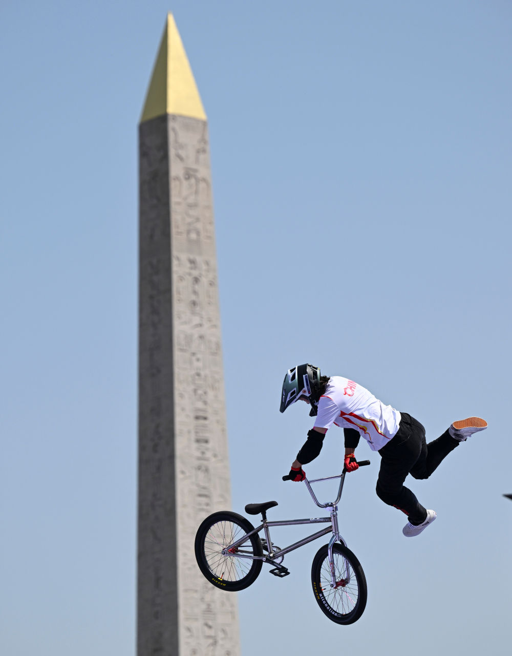 ↑7月30日,中国选手孙佳琪参加自由式小轮车女子公园赛预赛,腾空翻转时巴黎协和广场上的方尖碑旁就在她身旁。