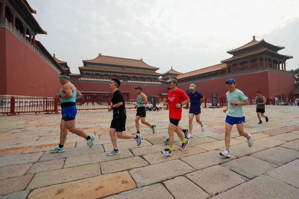 ↑2024年7月6日,晨跑爱好者奔跑在故宫午门前。