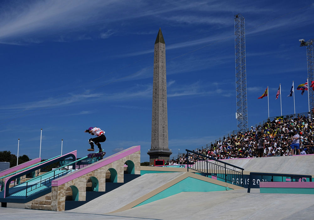 ↑7月28日,中国选手崔宸曦在巴黎协和广场进行的滑板女子街式预赛中。