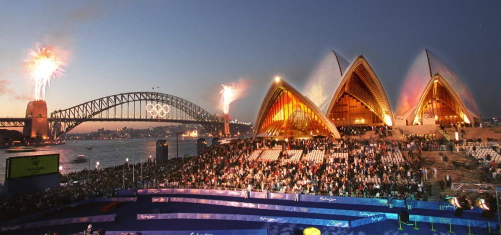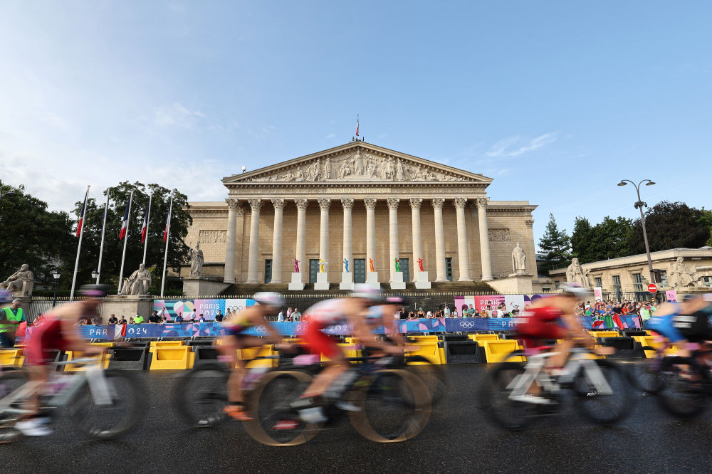 ↑7月31日,铁人三项参赛选手比赛中骑行经过法国国民议会所在地波旁宫。