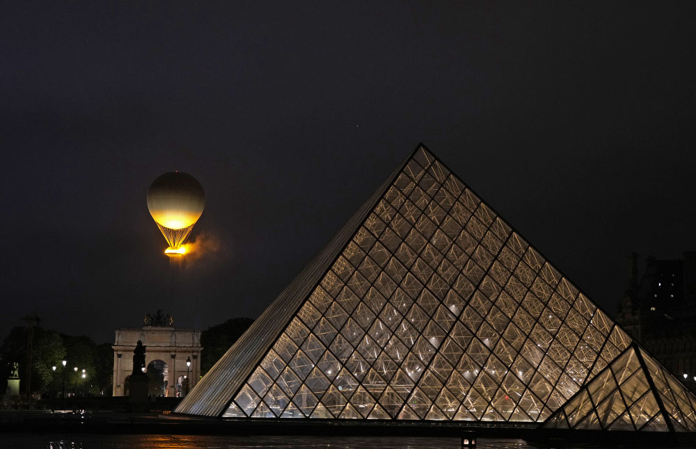 ↑7月26日,以卢浮宫玻璃金字塔为前景拍摄的热气球状主火炬。