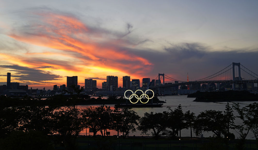 ↑2021年7月21日,位于东京湾的奥运五环标志被点亮。