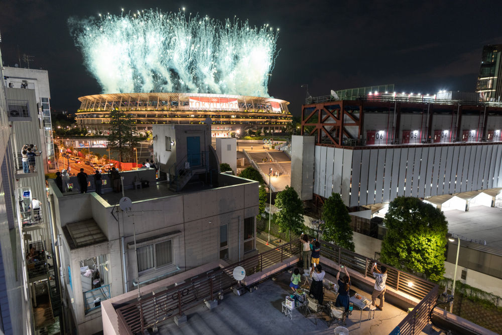 ↑2021年7月23日,东京当地居民在自家屋顶观看奥运会开幕式焰火。