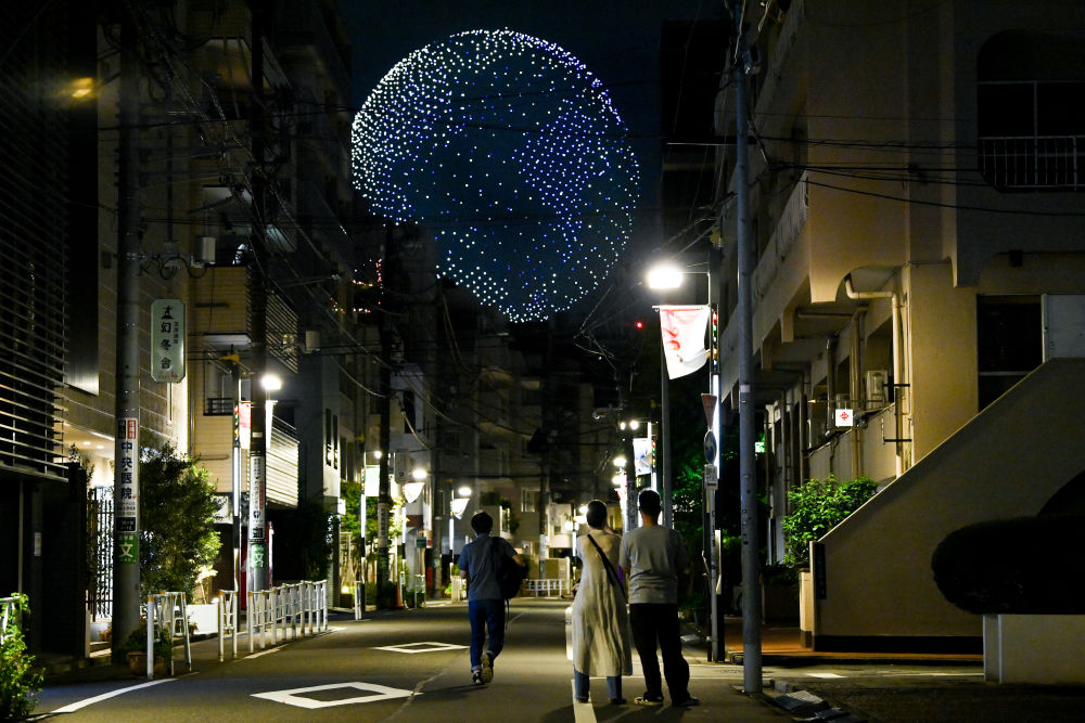 ↑2021年7月23日,在东京街头,人们驻足观看奥运会开幕式期间新国立竞技场上空的无人机表演。