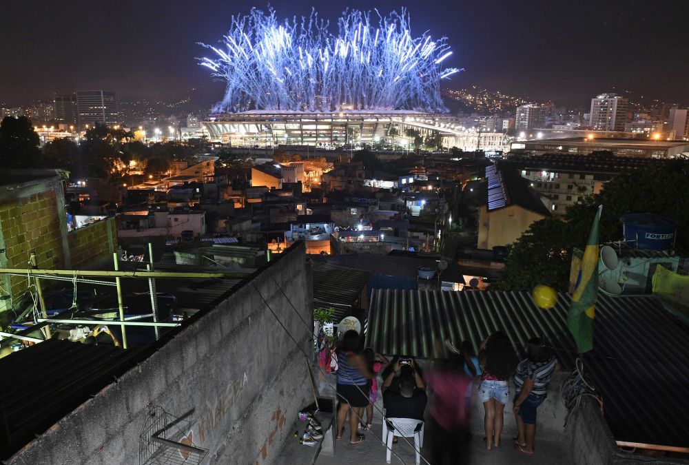 ↑2016年8月5日,在里约热内卢曼盖拉贫民区,几名当地居民在天台上观看奥运会开幕式焰火。