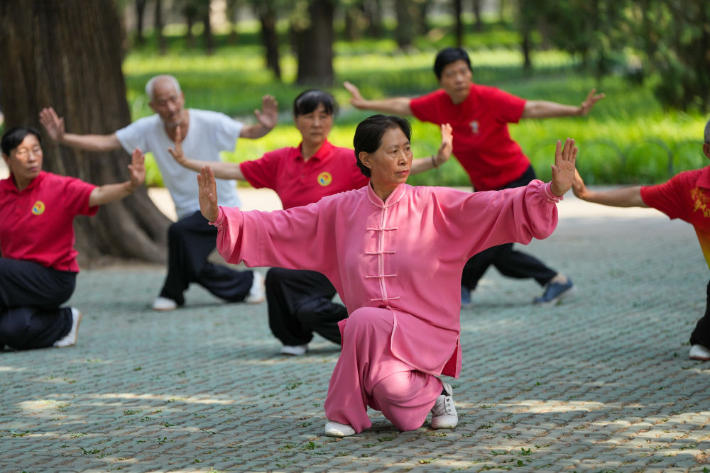 ↑2024年6月28日,在北京天坛公园内,市民打太极锻炼。