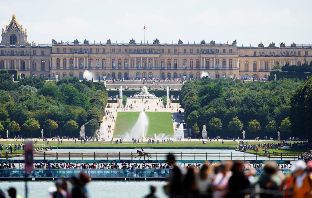 ↑7月28日,中国选手华天参加马术比赛三项赛个人越野赛。凡尔赛宫拥有悠久马术传统,是巴黎奥运会马术项目的举办地,