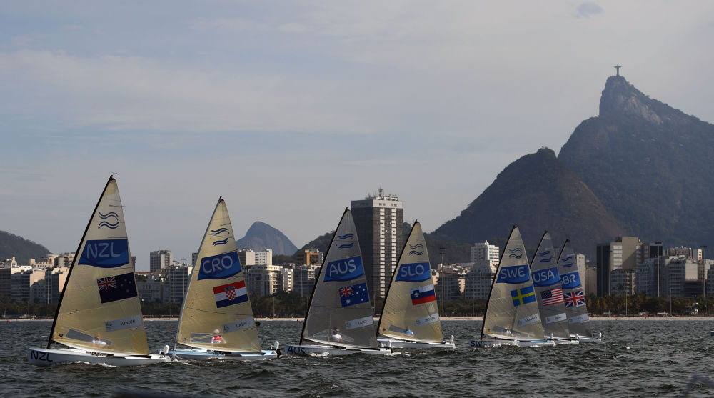 ↑2016年8月16日,选手们在里约奥运会男子芬兰人级比赛中。背景是里约热内卢科尔科瓦多山上的基督像。