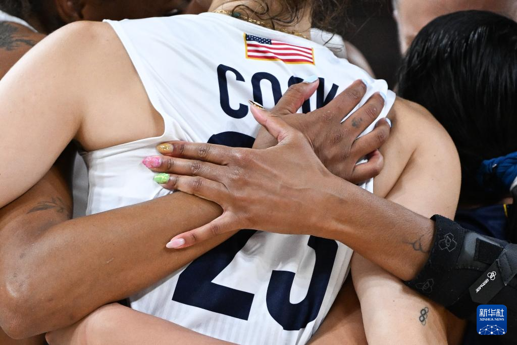 8月4日,法国队选手博尔(左)与队友卡扎特在比赛结束后拥抱在一起。