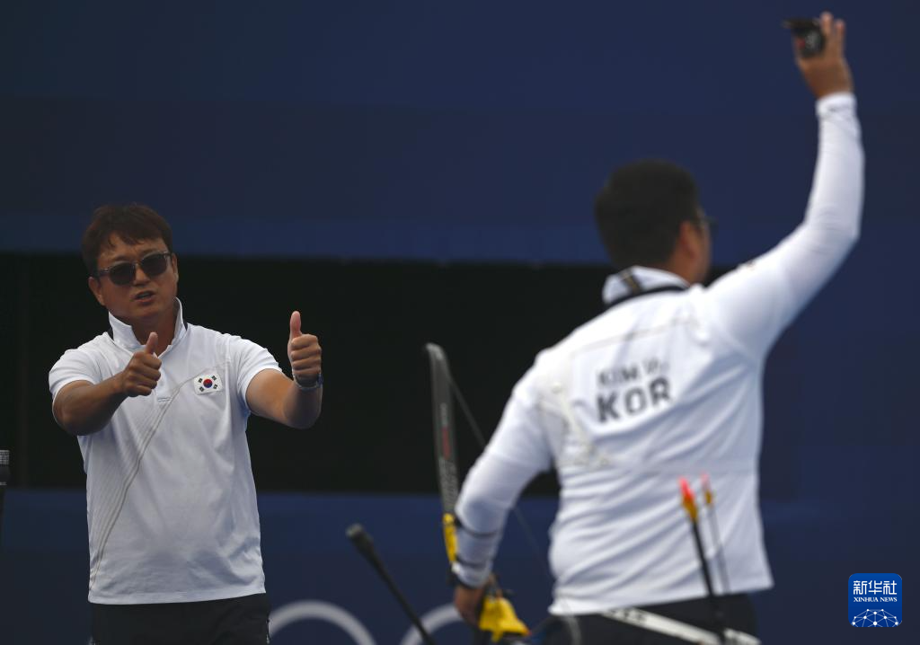 8月4日,韩国队教练(左)祝贺韩国选手金优镇在比赛中晋级。新华社记者 侯昭康 摄