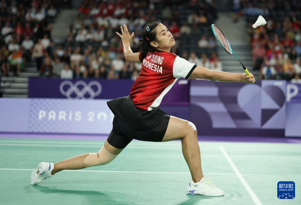 8月4日,印度尼西亚选手玛丽斯卡在比赛中回球。