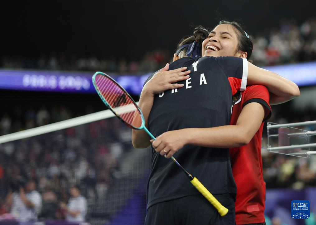 8月4日,韩国选手安洗莹(前)与印度尼西亚选手玛丽斯卡在比赛后拥抱致意。