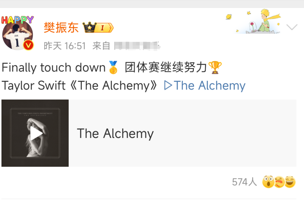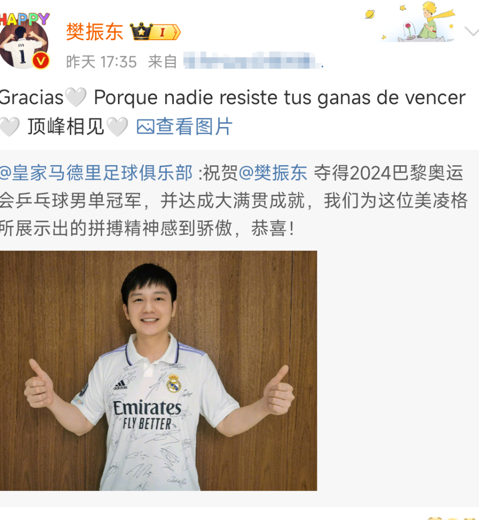 “足乒两栖”的球迷都知道,樊振东是西甲皇马俱乐部的球迷、泰勒·斯威夫特的粉丝,在巴黎奥运会上,“小胖”也没忘记晒出所爱。