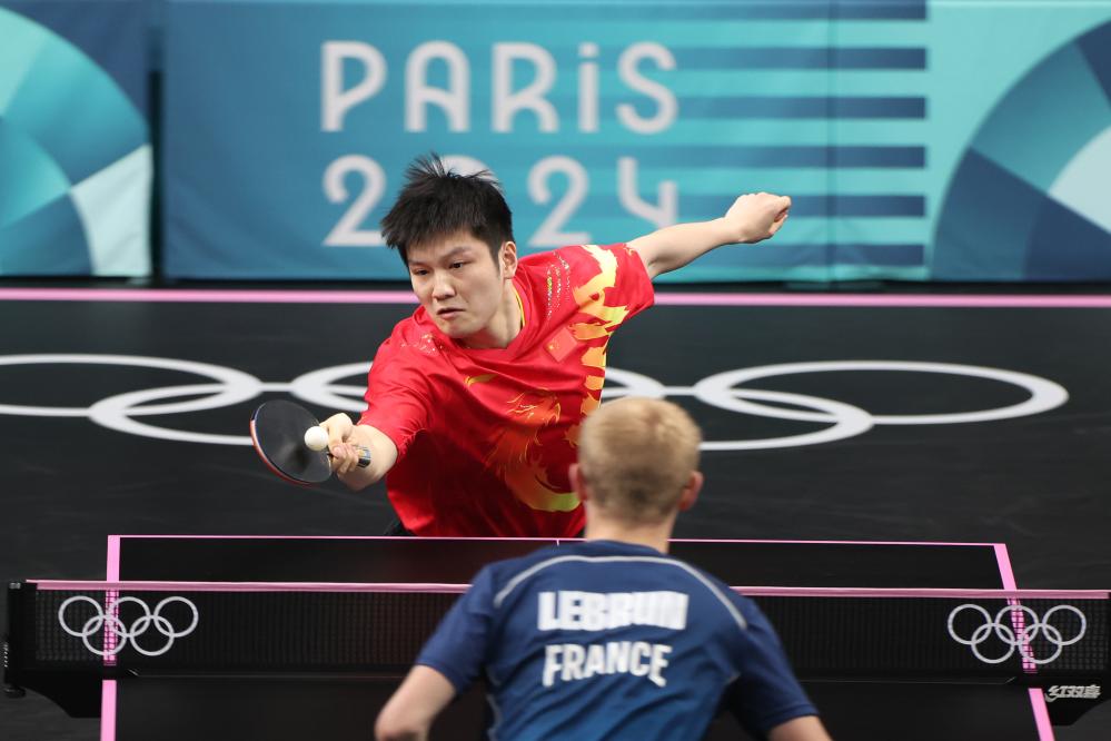 8月2日,樊振东(上)在比赛中。当日,在巴黎奥运会乒乓球男单半决赛中,中国选手樊振东4比0战胜法国选手菲利克斯·勒布伦,晋级决赛。新华社记者 刘续 摄