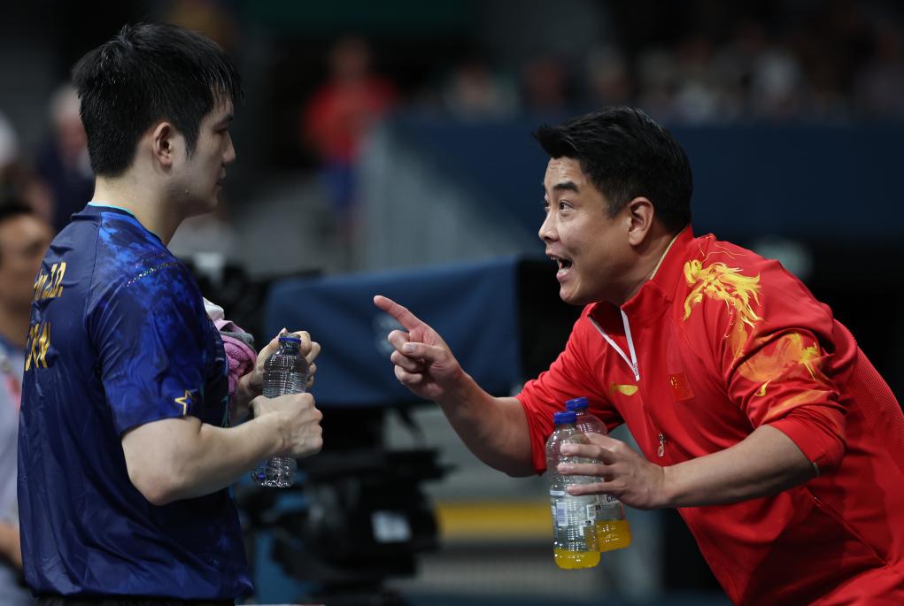 8月1日,中国队教练王皓(右)指导樊振东。当日,在巴黎奥运会乒乓球男单四分之一决赛中,中国选手樊振东4比3战胜日本选手张本智和,晋级四强。新华社记者 王东震 摄