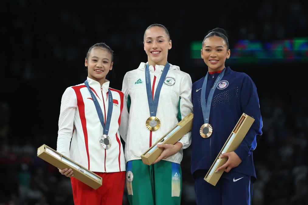 8月4日,冠军阿尔及利亚选手内穆尔(中)、亚军中国选手邱祺缘(左)和季军美国选手苏妮莎·李在颁奖仪式上。新华社记者 曹灿 摄